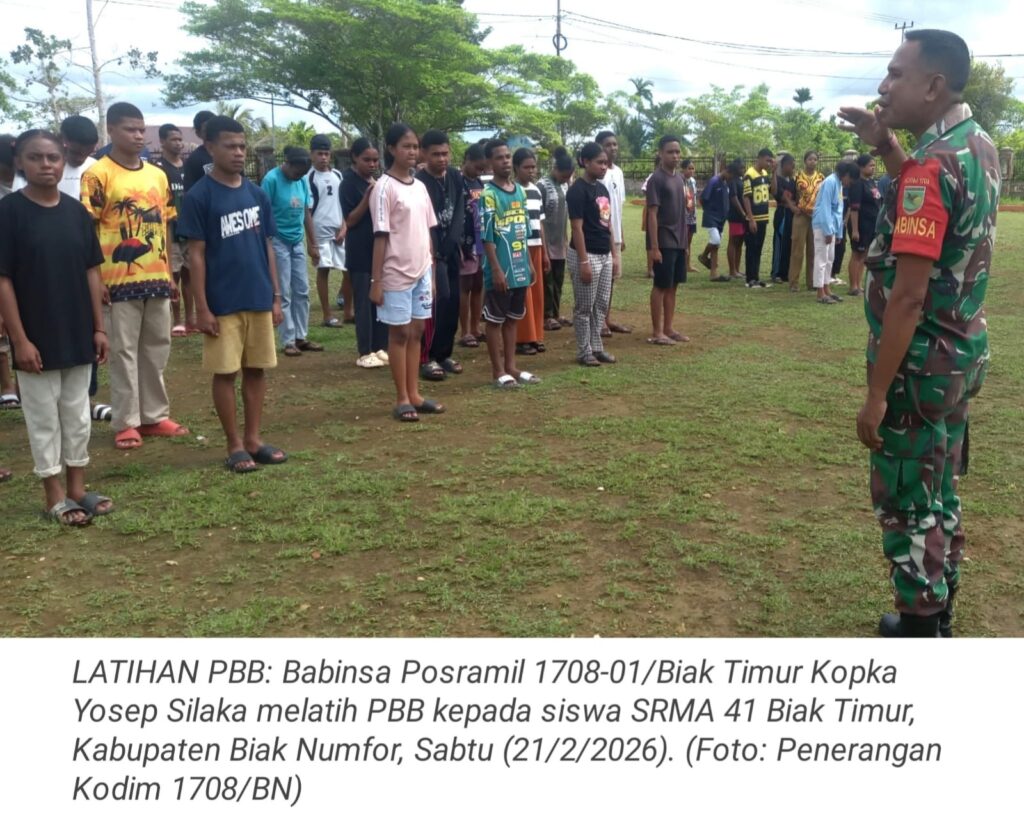 TOP-NEWS.id, BIAK TIMUR – Babinsa Posramil 1708-01/Biak Timur Kopka Yosep Silaka melatih Peraturan Baris Berbaris (PBB) kepada siswa Sekolah Rakyat Menengah Atas(SRMA) 41 Biak Timur, Kabupaten Biak Numfor, Provinsi Papua, Sabtu (21/2/2026).