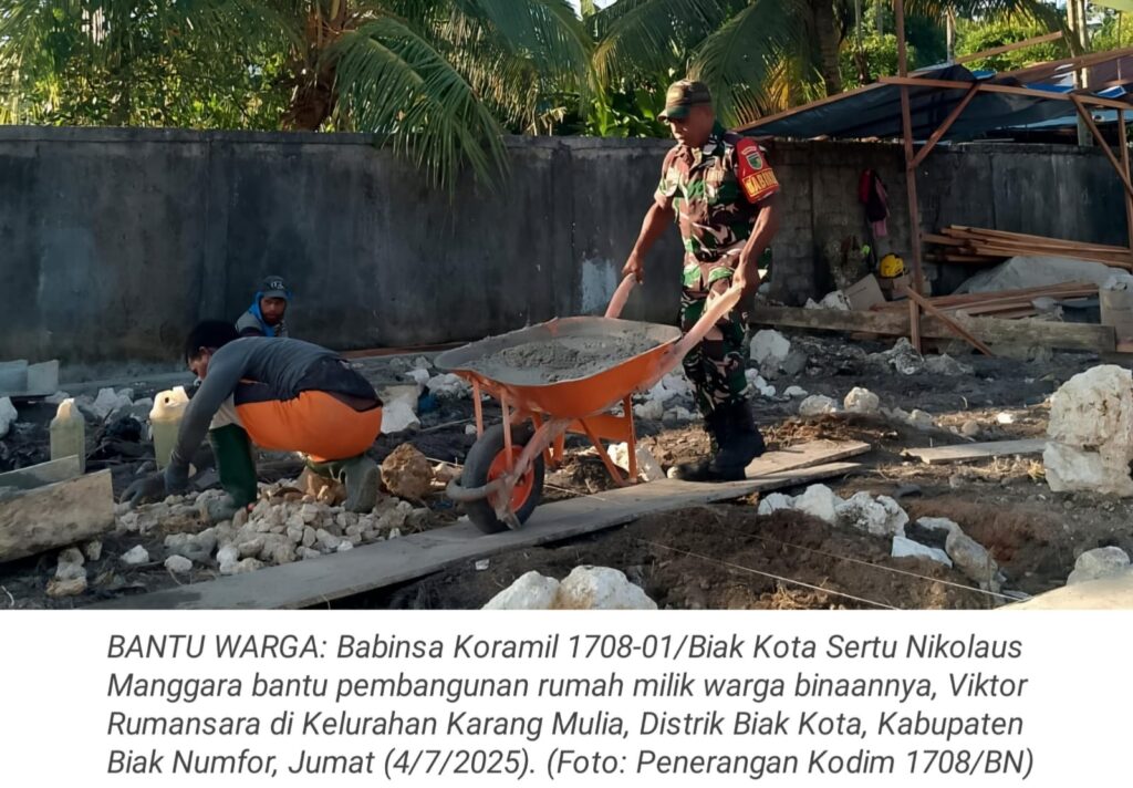 TOP-NEWS.id, BIAK – Upaya mempererat hubungan TNI dengan masyarakat serta menumbuhkan semangat gotong- royong, Babinsa Koramil 1708-01/Biak Kota, Sertu Nikolaus Manggara melaksanakan kegiatan karya bakti membantu pembangunan rumah milik warga binaannya, Viktor Rumansara di Kelurahan Karang Mulia, Distrik Biak Kota, Kabupaten Biak Numfor, Papua, Jumat (4/7/2025).