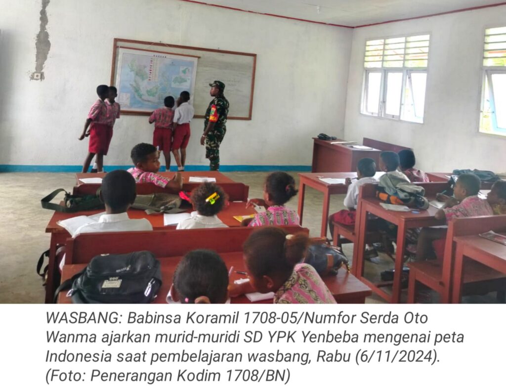 Selain materi tentang wasbang, Serda Oto juga mengajarkan murid-murid SD YPK Yenbeba mengenai peta Indonesia. Dirinya juga memperkenalkan peta sebagai alat untuk memahami luas dan keragaman Indonesia.