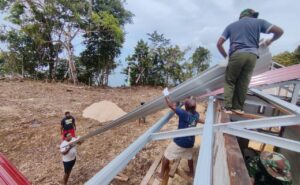 Pembangunan 10 unit rumah untuk masyarakat setempat masih terus berlangsung, dengan fokus utama saat ini adalah pemasangan atap seng.