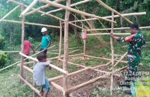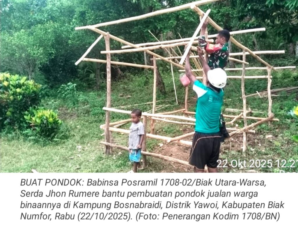 TOP-NEWS.id, BIAK NUMFOR – Wujud kepedulian terhadap warga binaan, Babinsa Posramil 1708-02/Biak Utara-Warsa, Serda Jhon Rumere ikut membantu salah satu warga membuat pondok jualan di Kampung Bosnabraidi, Distrik Yawoi, Kabupaten Biak Numfor, Papua, Rabu (22/10/2025).