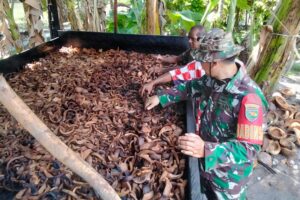 Dalam kegiatan tersebut, Serka Sampurno terlibat langsung mulai dari proses membelah kelapa, mencungkil daging kelapa, hingga tahap pengeringan menggunakan metode pengasapan.