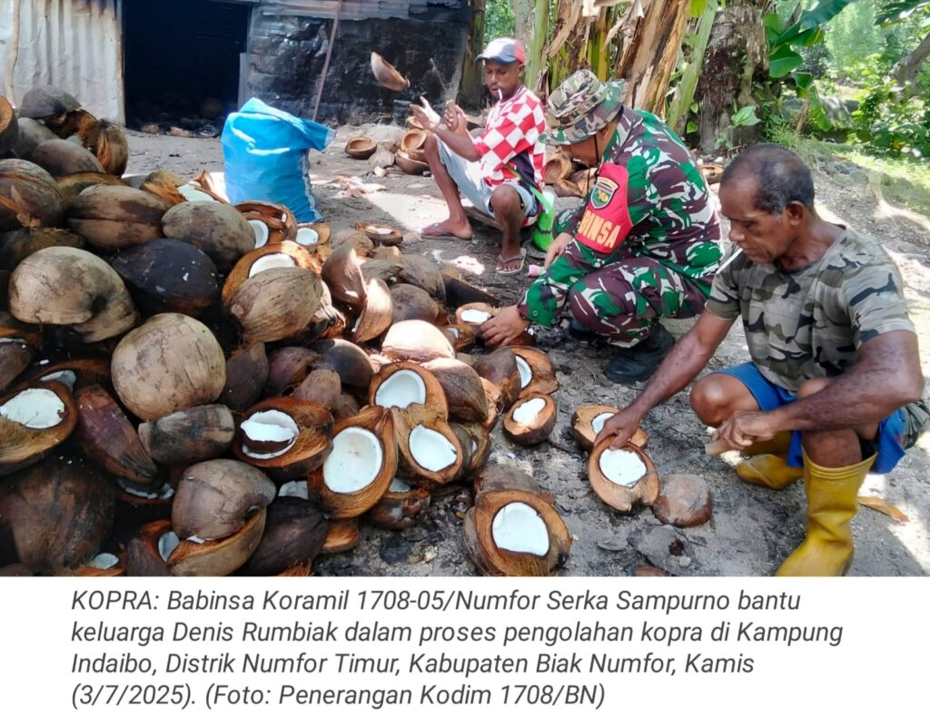 TOP-NEWS.id, NUMFOR – Babinsa Koramil 1708-05/Numfor Serka Sampurno menunjukkan kepeduliannya terhadap warga binaan dengan membantu proses pengolahan kopra di Kampung Indaibo, Distrik Numfor Timur, Kabupaten Biak Numfor, Papua, Kamis (3/7/2025).