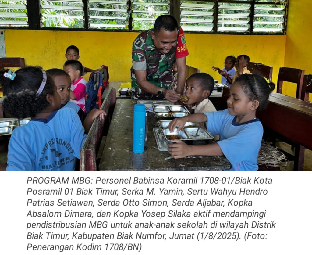 TOP-NEWS.id, BIAK TIMUR – Babinsa Koramil 1708-01/Biak Kota, Posramil 01 Biak Timur, Serka M. Yamin, Sertu Wahyu Hendro Patrias Setiawan, Serda Otto Simon, Serda Aljabar, Kopka Absalom Dimara, dan Kopka Yosep Silaka, aktif mendampingi kegiatan pendistribusian Makan Bergizi Gratis (MBG) untuk anak-anak sekolah di wilayah Distrik Biak Timur, Kabupaten Biak Numfor, Papua, Jumat (1/8/2025).