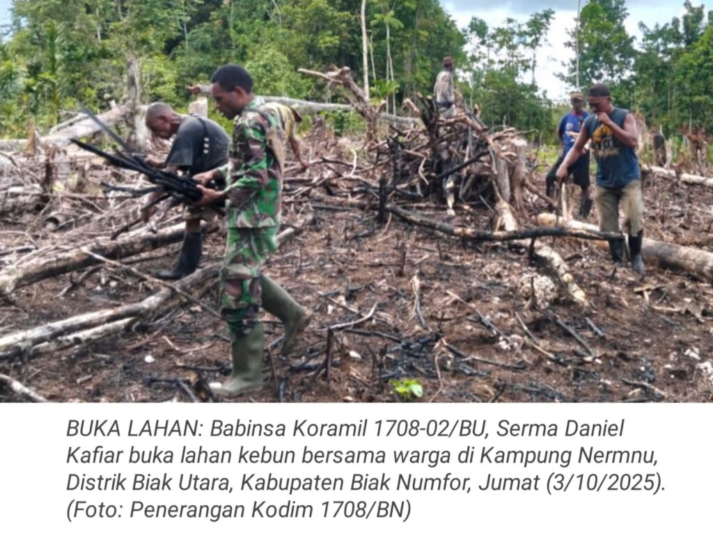 TOP-NEWS.id, BIAK UTARA – Babinsa Koramil 1708-02/BU, Serma Daniel Kafiar melaksanakan kegiatan pembukaan lahan kebun bersama warga di Kampung Nermnu. Kegiatan gotong-royong ini dilakukan sebagai bentuk kepedulian TNI terhadap kesejahteraan masyarakat di wilayah binaan Distrik Biak Utara, Kabupaten Biak Numfor, Papua, Jumat (3/10/2025).