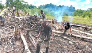 Tingkatkan Hampangan, Babinsa Biak Utara dan Warga Gotong-Royong Buka Lahan Kebun