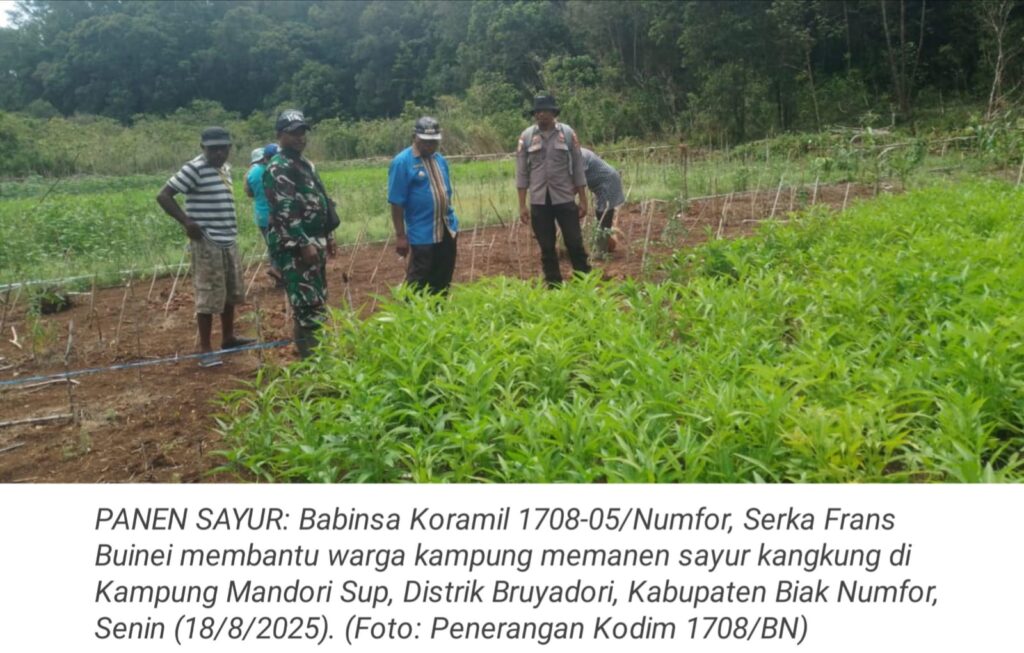 TOP-NEWS.id, KEPULAUAN NUMFOR – Dalam rangka mendukung program ketahanan pangan (hanpangan) nasional, Babinsa Koramil 1708-05/Numfor, Serka Frans Buinei turun langsung membantu warga kampung memanen sayur kangkung, di Kampung Mandori Sup, Distrik Bruyadori, Kabupaten Biak Numfor, Papua, Senin (18/8/2025).