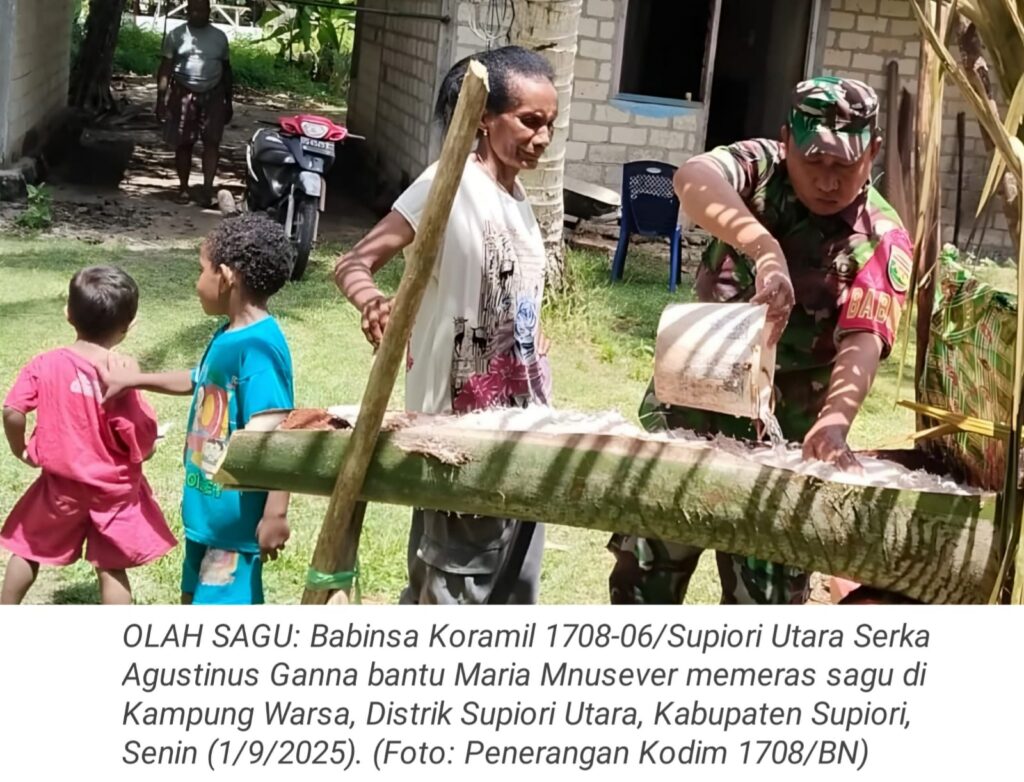 TOP-NEWS.id, SUPIORI – Sebagai bentuk nyata kedekatan TNI dengan masyarakat, Serka Agustinus Ganna, Babinsa Koramil 1708-06/Supiori Utara membantu salah satu warga binaan proses pengolahan sagu di Kampung Warsa, Distrik Supiori Utara, Kabupaten Supiori, Papua, Senin (1/9/2025).