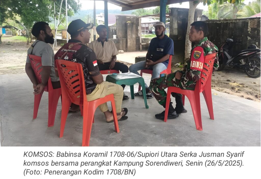 TOP-NEWS.id, SUPIORI – Upaya mempererat hubungan dan meningkatkan sinergi di wilayah binaannya, Babinsa Koramil 1708-06/Supiori Utara Serka Jusman Syarif melaksanakan komunikasi sosial (komsos) bersama perangkat Kampung Sorendiweri.