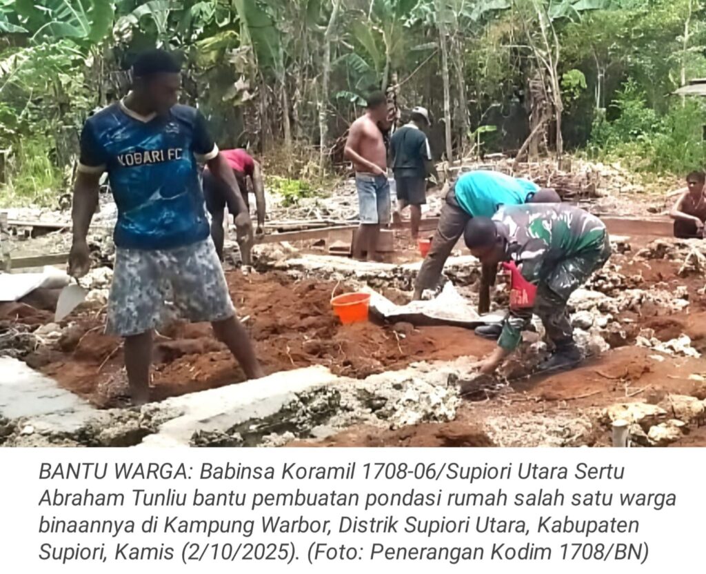 TOP-NEWS.id, BIAK – Bentuk kepedulian kepada masyarakat kembali ditunjukkan oleh Babinsa Koramil 1708-06/Supiori Utara Sertu Abraham Tunliu membantu pembuatan rumah salah satu warga binaannya yang berada di Kampung Warbor, Distrik Supiori Utara, Kabupaten Supiori, Papua, Kamis (2/10/2025).