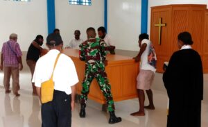 TOP-NEWS.id, BIAK TIMUR – Wujud kepedulian dan kebersamaan antara TNI dan masyarakat, Babinsa Posramil 1708-01/Biak Timur, Serda Renold Mnsen turut membantu warga jemaat Getsemani Adibai mempersiapkan peresmian gereja di Kampung Rimba Jaya, Kabupaten Biak Numfor, Papua, Rabu (29/10/2025).