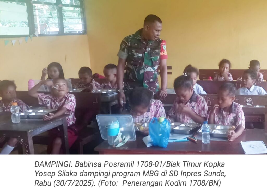 TOP-NEWS.id, BIAK TIMUR – Babinsa Posramil 1708-01/Biak Timur menunjukkan komitmen nyata dalam mendukung program pemerintah untuk meningkatkan gizi anak-anak sekolah melalui kegiatan pendampingan penyaluran Makanan Bergizi Gratis (MBG) di wilayah Distrik Biak Timur, Kabupaten Biak Numfor, Papua, Rabu (30/7/2025).