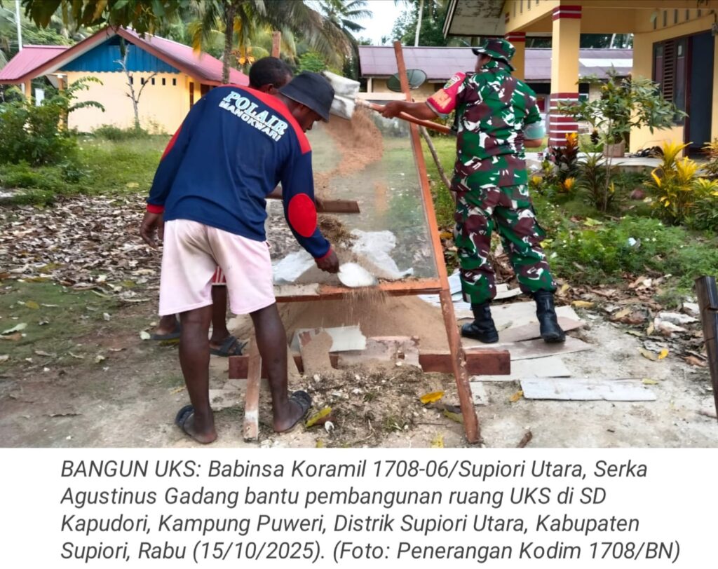 TOP-NEWS.id, SUPIORI – Sebagai bentuk kepedulian terhadap masyarakat dan dukungan terhadap dunia pendidikan, Babinsa Koramil 1708-06/Supiori Utara, Serka Agustinus Gadang, turun langsung membantu pembangunan ruang Unit Kesehatan Sekolah (UKS) di SD Kapudori, Kampung Puweri, Distrik Supiori Utara, Kabupaten Supiori, Papua, Rabu (15/10/2025).