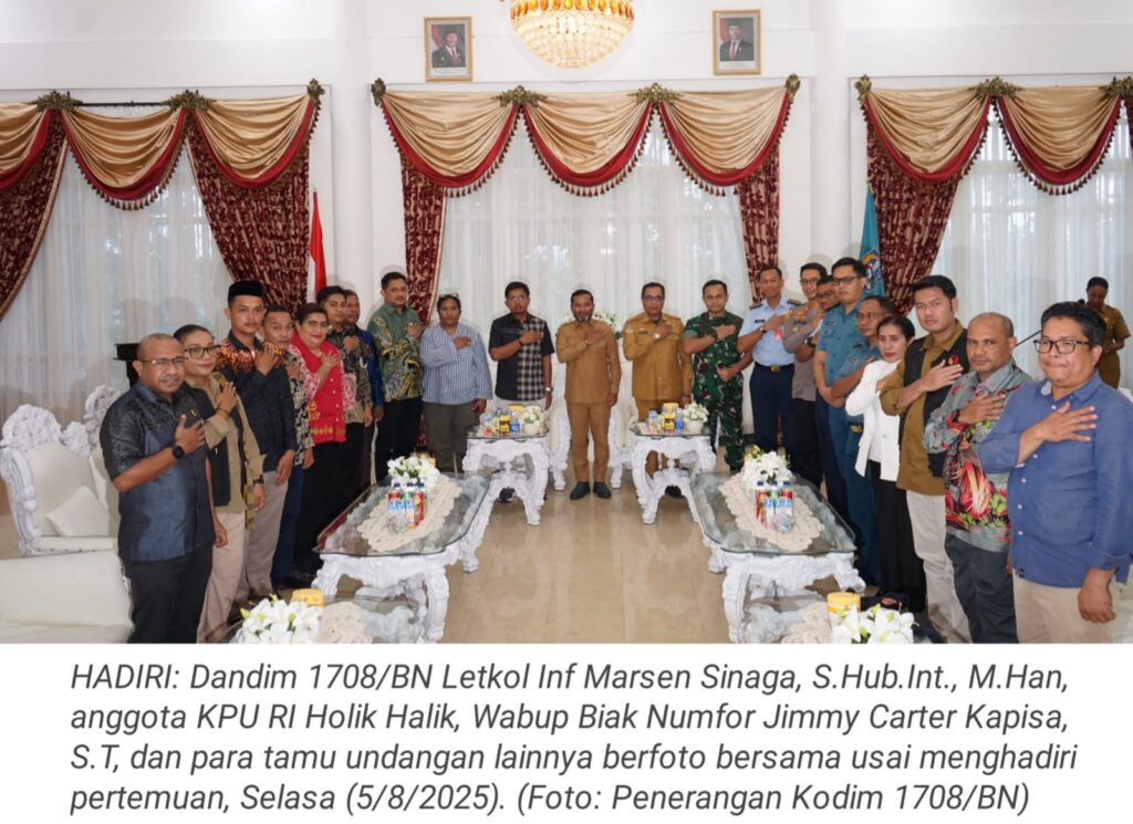TOP-NEWS.id, BIAK – Dalam rangka memastikan kesiapan pelaksanaan Pemungutan Suara Ulang (PSU) Pemilihan Gubernur (Pilgub) dan Wakil Gubernur (Wagub) Papua 2025, Komandan Kodim (Dandim) 1708/BN Letkol Inf Marsen Sinaga, S.Hub.Int., M.Han bersama Forum Koordinasi Pimpinan Daerah (Forkopimda) Kabupaten Biak Numfor menghadiri pertemuan bersama anggota Komisi Pemilihan Umum Republik Indonesia (KPU RI) Holik Halik.