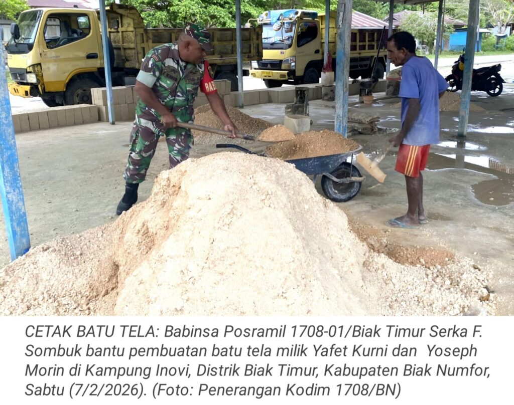 TOP-NEWS.id, BIAK TIMUR – Kepedulian terhadap warga binaan terus ditunjukkan Babinsa Posramil 1708-01/Biak Timur Serka F. Sombuk dengan turun langsung membantu pembuatan batu tela milik Yafet Kurni dan Yoseph Morin di Kampung Inovi, Distrik Biak Timur, Kabupaten Biak Numfor, Papua, Sabtu (7/2/2026).