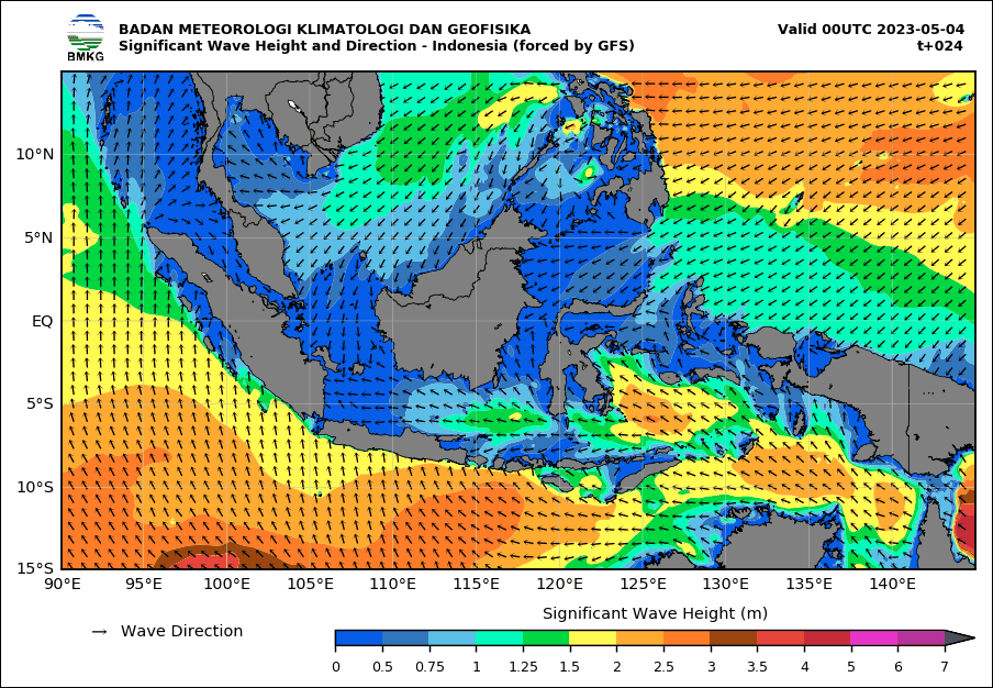 Dalam Peringatan Gelombang Tinggi yang dikeluarkan BMKG pada Kamis,4 Mei 2023 pukul 06:00 WIB dan berlaku mulai pukul 07:00 WIB samoai Jumat, 5 Mei 2023 pukul 07:00 WIB, disebutkan pola angin di wilayah Indonesia bagian utara dominan bergerak dari Timur Laut – Tenggara dengan kecepatan angin berkisar 5 – 20 knot.
