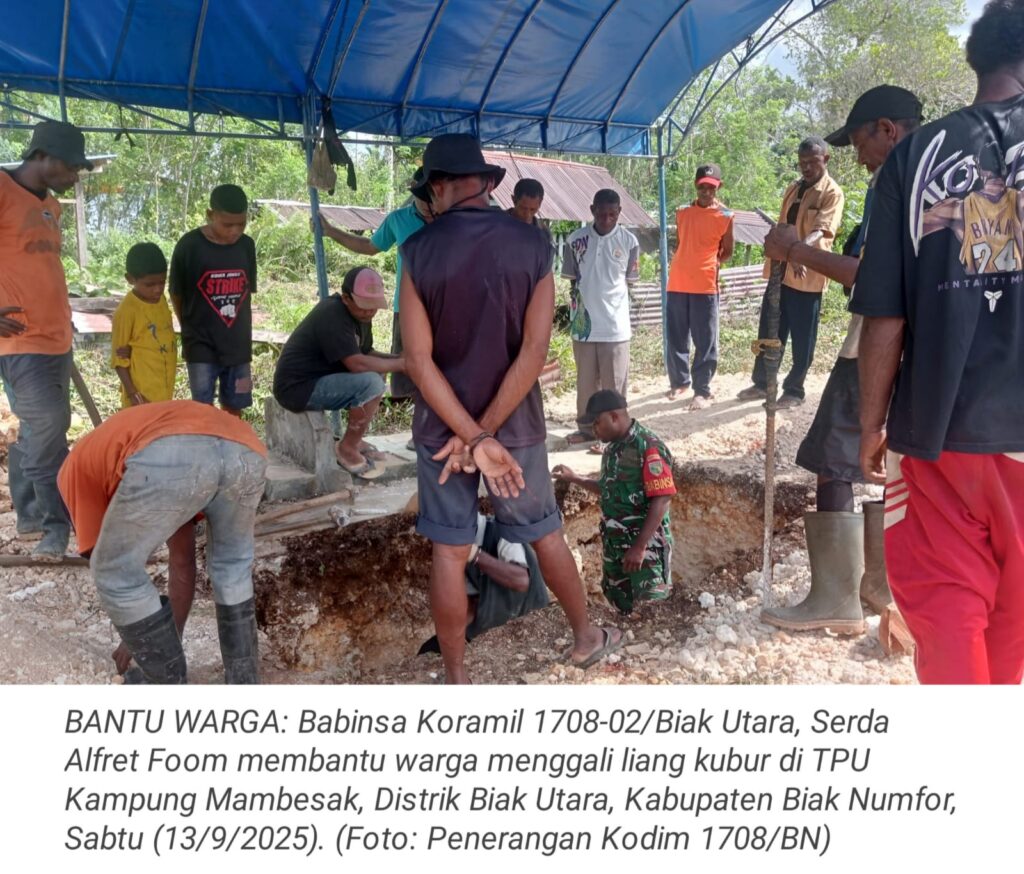 TOP-NEWS.id, BIAK UTARA – Sebagai bentuk kepedulian dan pengabdian kepada masyarakat, Babinsa Koramil 1708-02/Biak Utara, Serda Alfret Foom membantu warga penggalian liang kubur di Tempat Pemakaman Umum (TPU) Kampung Mambesak, Distrik Biak Utara, Kabupaten Biak Numfor, Papua, Sabtu (13/9/2025).