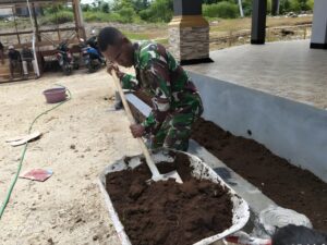 Dengan penuh semangat, Babinsa dan warga terlihat kompak mengisi pot bunga di halaman gereja menggunakan tanah dan menanaminya dengan berbagai jenis tanaman hias.