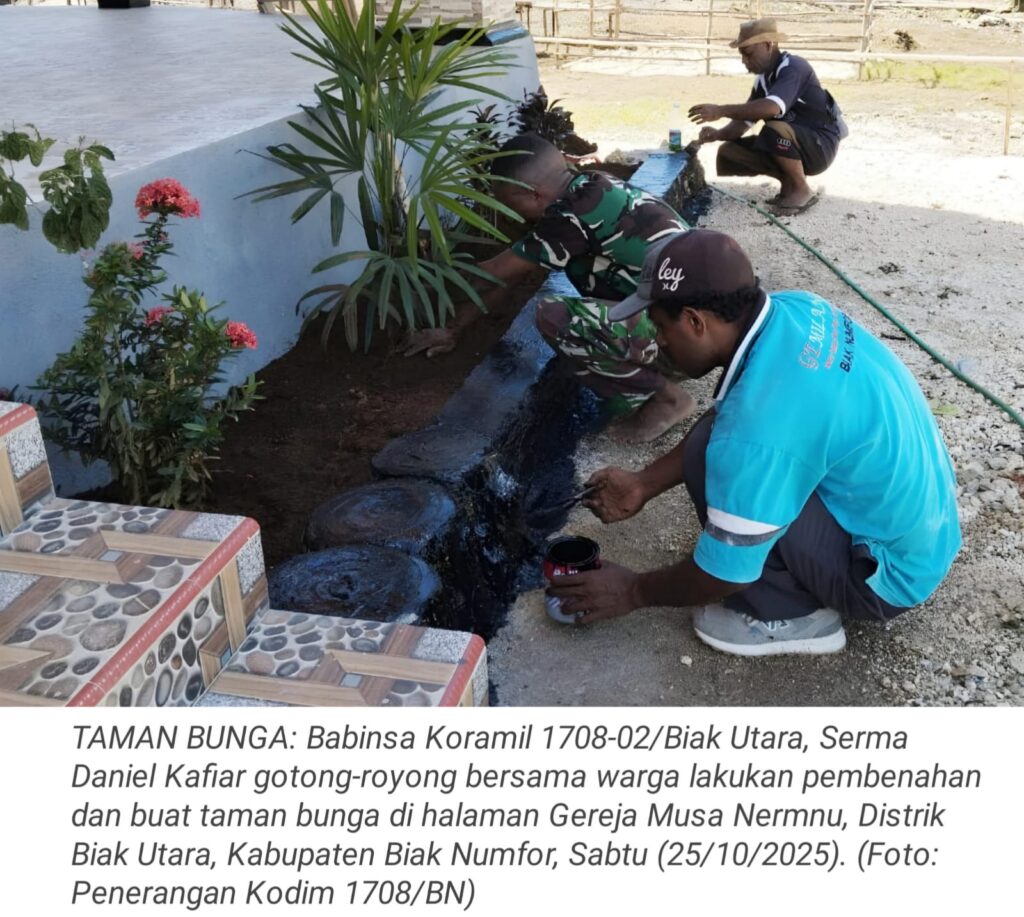 TOP-NEWS.id, BIAK UTARA – Dalam semangat kebersamaan dan kepedulian terhadap lingkungan, Babinsa Koramil 1708-02/Biak Utara, Serma Daniel Kafiar bersama warga melaksanakan kegiatan gotong-royong pembenahan serta pembuatan taman bunga di halaman Gereja Musa Nermnu, Distrik Biak Utara, Kabupaten Biak Numfor, Papua, Sabtu (25/10/2025).