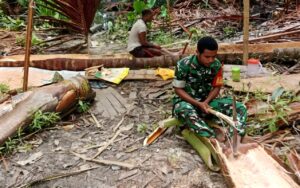 TOP-NEWS.id, WARSABabinsa Posramil 1708-02/Biak Utara-Warsa, Sertu Jhon Rumere membantu warga mengolah pohon sagu menjadi bahan makanan di Kampung Imbari, Distrik Warsa, Kabupaten Biak Numfor, Papua, Sabtu (18/4/2026).