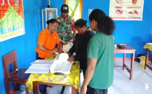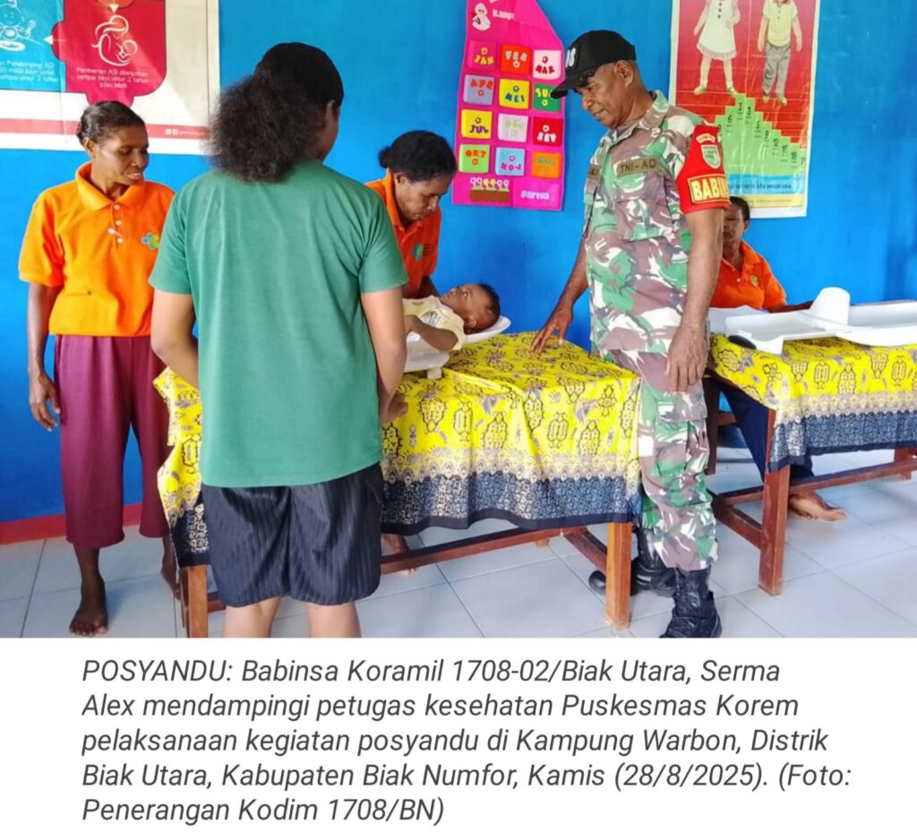 TOP-NEWS.id, BIAK – Dalam rangka membangun sinergitas dan kebersamaan dalam pelayanan kesehatan masyarakat demi mewujudkan generasi yang sehat dan kuat, Babinsa Koramil 1708-02/Biak Utara, Serma Alex mendampingi petugas kesehatan dari Puskesmas Korem dalam pelaksanaan kegiatan pos pelayanan terpadu (posyandu) di Kampung Warbon, Distrik Biak Utara, Kabupaten Biak Numfor, Papua, Kamis (28/8/2025).