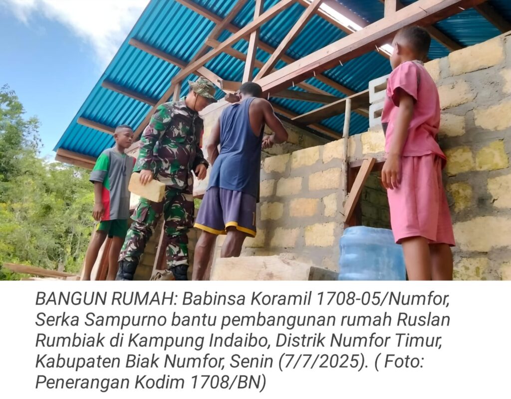 TOP-NEWS.id, NUMFOR – Wujud nyata kepedulian TNI terhadap masyarakat terus ditunjukkan oleh para Babinsa di wilayah tugasnya. Seperti yang dilakukan Babinsa Koramil 1708-05/Numfor, Serka Sampurno, yang turut membantu warganya dalam pekerjaan pembangunan rumah di Kampung Indaibo, Distrik Numfor Timur, Kabupaten Biak Numfor, Provinsi Papua, Senin (7/7/2025).