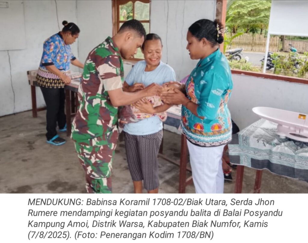 TOP-NEWS.id, WARSA – Wujudkan Balita sehat dan mendukung program pemerintah di bidang kesehatan, Babinsa Koramil 1708-02/Biak Utara, Serda Jhon Rumere,l mendampingi kegiatan posyandu balita di Balai Posyandu Kampung Amoi, Distrik Warsa, Kabupaten Biak Numfor, Papua, Kamis (7/8/2025).