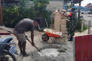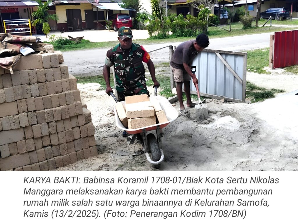 TOP-NEWS.id, BIAK – Wujud kepedulian dan kebersamaan antara TNI dan rakyat, Babinsa Koramil 1708-01/Biak Kota Sertu Nikolas Manggara melaksanakan karya bakti membantu pembangunan rumah milik salah satu warga binaannya di Kelurahan Samofa, Kabupaten Biak Numfor, PapuaKamis (13/2/2025).