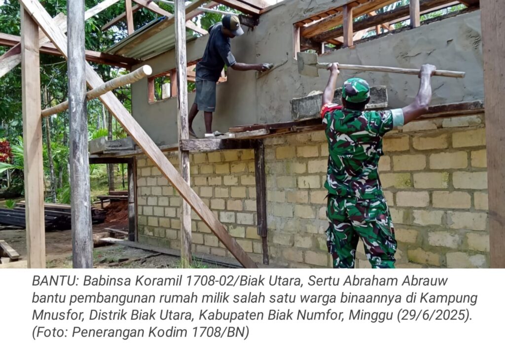 TOP-NEWS.id, BIAK UTARA – Bentuk kebersamaan dan kepedulian Babinsa terhadap warga terus ditunjukkan oleh Babinsa Koramil 1708-02/Biak Utara, Sertu Abraham Abrauw dengan membantu pembangunan rumah milik salah satu warga binaannya di Kampung Mnusfor, Distrik Biak Utara, Kabupaten Biak Numfor, Papua, Minggu (29/6/2025).