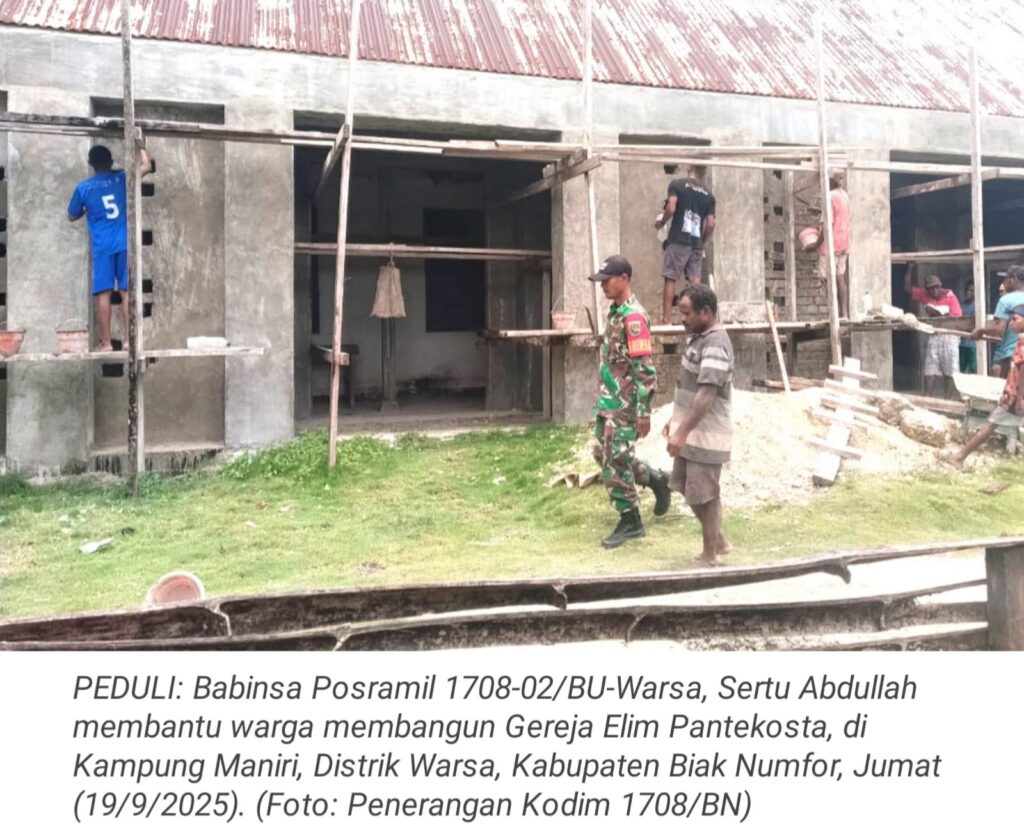 TOP-NEWS.id, WARSA – Wujud kepedulian terhadap kegiatan keagamaan dan sosial di wilayah binaannya, Babinsa Posramil 1708-02/BU-Warsa, Sertu Abdullah turun langsung membantu warga membangun Gereja Elim Pantekosta, di Kampung Maniri, Distrik Warsa, Kabupaten Biak Numfor, Papua, Jumat (19/9/2025).